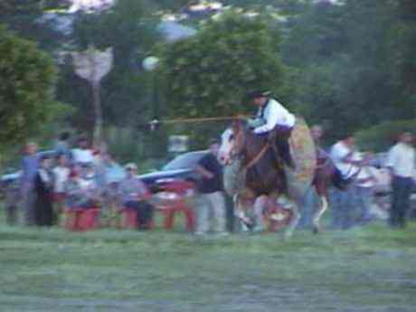 En esta escena el jinete inicia un circuito donde debe hacer blanco en cinco objetos especificos. Esta destreza rememora la valiente lucha de los Gauchos en la Guerra por la Independencia.