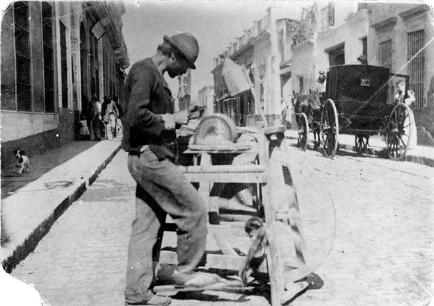 l primer afilador que recorrió las calles de Salta fue un italiano. Llegó seguramente a bordo del ferrocarril y bajó con su máquina extraña que el público quizás confundía con la máquina manual de tizar lana. El sonido armonioso de la brusca escala que soplaba en su flauta, fue el pregón inédito que hizo salir a las puertas de las casa a las encargadas del cuidado del hogar, secándose las manos en el delantal, al haber interrumpido el trajín lleno de aromas de la cocina, preguntaban de que se trataba. Una averiguó al italiano qué es lo que ofrecía.