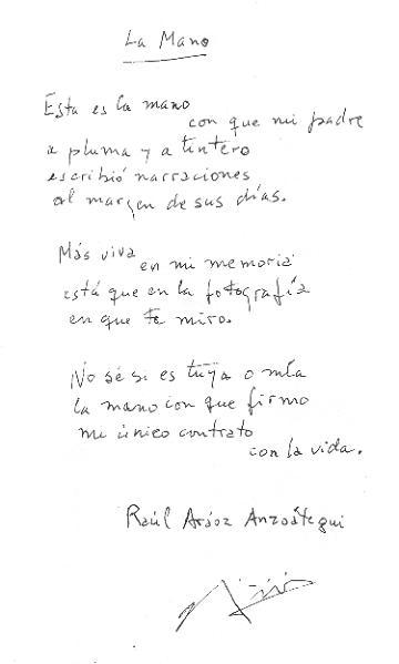 Raúl Aráoz Anzoátegui dedicó hermosas páginas a su padre, don Ernesto M. Aráoz (1891-1971), singular escritor autor, entre otros títulos, del libro El diablito del cabildo; la edición de 1991, facsímil de la primera, con notas manuscritas del autor, cierra, como colofón La mano , poema de Raúl Aráoz Anzoátegui en homenaje, de puño y letra, a su padre.