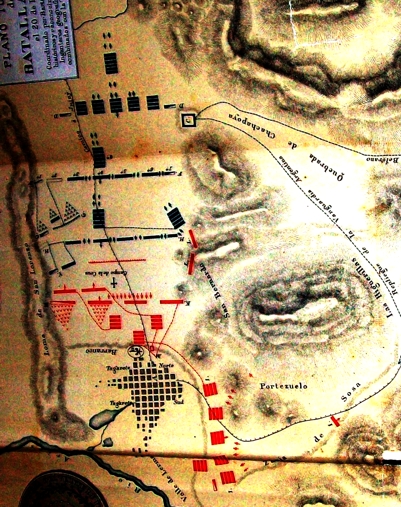 Hasta qe. obscurecio permaneci en aquella situacion, y luego reuní en masa sobre la columna del centro las quatro restantes de ambos costados, destinando á la custodia de las carretas los cuerpos de reserva tanto de infantería y caballeria, y no quise valerme de las granadas pr. no perjudicar tal vez á las personas oprimidas por la tirania, ni hacer destrozos en un Pueblo qe. no tenia la culpa de qe. se abrigasen en él nros enemigos.