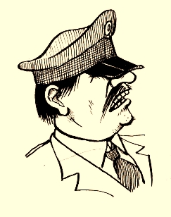 Era moreno, robusto y bajo, con una sonrisa perenne atrapada en sus labios entreabiertos, sobre los cuales mantenía rígido - por sus cerdas - un bigote con resabios orientales. Usaba la gorra de negra visera echada sobre los ojos, como si la tuviera grande. En su mano derecha llevaba enroscado un látigo sinuoso, de suela fina, que para suerte de los detenidos nunca llegaba a usar.