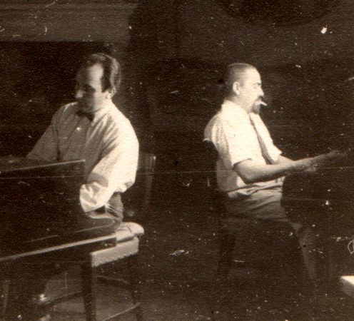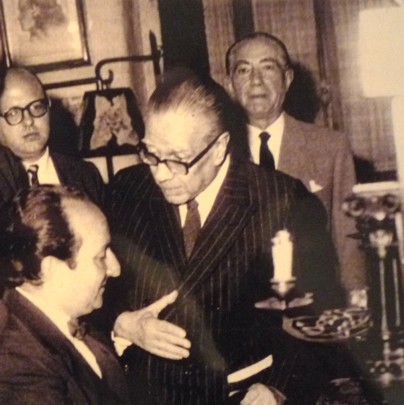 Botelli con Jorge Luis Borges, atrás se aprecia la figura de Pajarito Velarde Mors