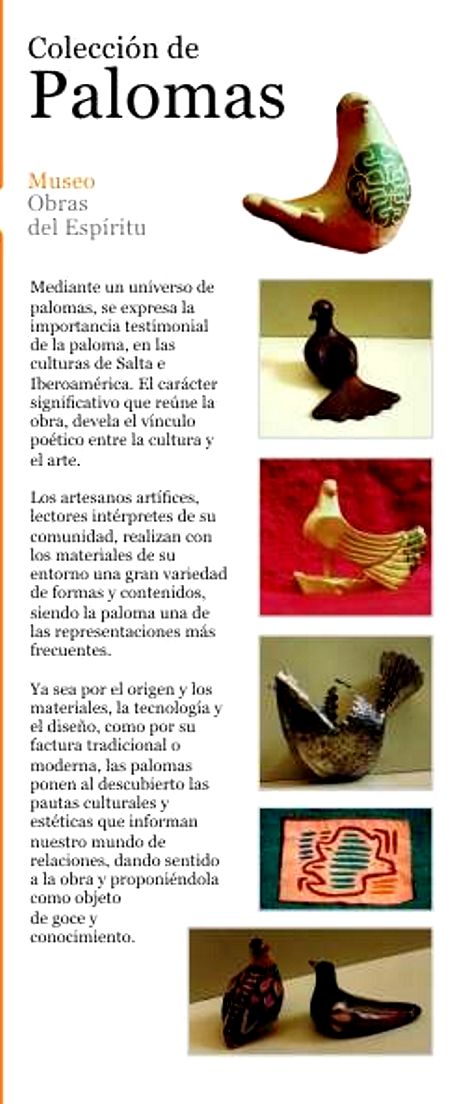 El MUSEO OBRAS DEL ESPÍRITU es una entidad de carácter itinerante. Las colecciones que le dan origen son, las de “Palomas” y de “Nacimientos”, material que por su tipología y raíz cultural, corresponde al arte popular de Iberoamérica.