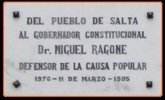 Hospital Neurosiquiátrico en Salta, Ra A principios de los años 70, Ragone pasó a liderar la Lista Verde con la identificación del ``médico del pueblo'', calificativo con el que se presentó como candidato a gobernador por el justicialismo salteño el 11 de marzo de 1973. La fórmula Ragone-Ríos obtuvo en aquella ocasión casi 121.500 votos, poco más del 57 por ciento de los votos del padrón electoral, en un triunfo aplastante sobre las otras fuerzas política de la provincia. Ese mismo día, tres años después, un 11 de marzo de 1976, cuando la provincia estaba intervenida, Ragone fue secuestrado cuando salía del almacén de Don Arredes a tres cuadras de su domicilio. Eran las 8.30 de un día lluvioso. Su cuerpo nunca apareció, convirtiéndose en el único ex gobernador desaparecido de la República Argentina. |