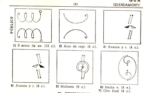 En el cuadro se muestra la coreografía de El Guardamonte, que tiene una introducción de 12 compases y 40 de baile, escrita en un compás de 6/8.