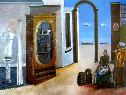 Su pintura evidencia lo metafísico, en la absoluta quietud creada a partir de sólidas formas arquitectónicas que estructuran un límite exacto del espacio, en el que aparecen los elementos formales como si estuvieran agregados porque sí, en un ámbito de ensoñación y misterio. A su vez plantea, de manera típicamente surrealista, un mundo imaginario que se acerca a lo onírico, alejándose de lo racional y de la realidad concreta.