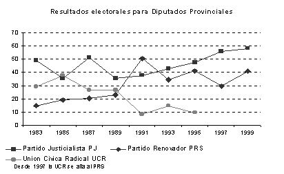 [11] Haciendo esta aclaración, en los datos, gráficos y comentarios posteriores la UCR se sumará a la línea del PRS. Hemos optado por mantener la denominación partidaria antes que la de las sucesivas alianzas que se constituyeron por razones prácticas y porque el peso electoral propio del PRS así lo justifica.