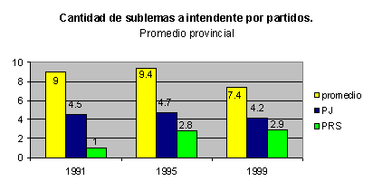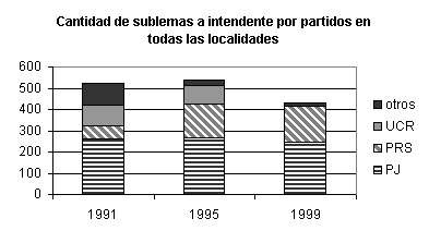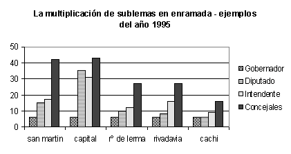 [23] Solo para darse una idea de la dimensión del problema. En 1995 Tartagal presenta 17 sublemas a intendente y 42 a concejales; en esa oportunidad el ganador tiene el 16% de los votos a su sublema, mientras que en otro lema hay un candidato que obtiene el 34,5% de los votos. Pocos meses después la situación desemboca en conflicto abierto y se interviene el municipio.