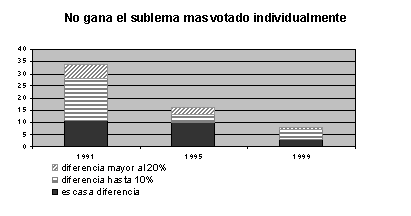 [22] Comparar la representatividad alcanzada por sublemas de distinto lema es salir del contexto de la ley de lemas y entrar de lleno en la posmoderna representación política personal, hablamos del dirigente representativo y no de la representación del partido como un todo, hablamos de la fuerza electoral del gobernante y no del partido de gobierno. Mientras que la ley de lemas supone lo contrario: que el votante elige primero un lema y después un sublema, dando por ganador al candidato preferido dentro de un partido que alcanza la mayoría.