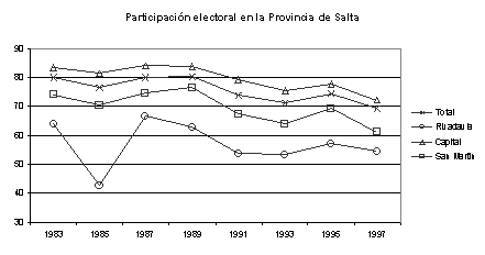 [17] En el municipio de Salta capital en 1995 se presentaron 12 sublemas justicialistas para intendente, pero como el municipio fue intervenido, se realizan elecciones solo 2 años después presentándose 3 candidatos de esa fuerza, y en la próxima se vuelve a la fragmentación con 10 sublemas peronistas de candidato a intendente. Todos los comentarios apuntan a la presencia de una estrategia única: Romero impuso tres sublemas para asegurar el triunfo de Enrique Tanoni, el candidato con mayor apoyo electoral, pero perdió la capital de esa manera y entonces libera la presentación de candidatos para la próxima vez.