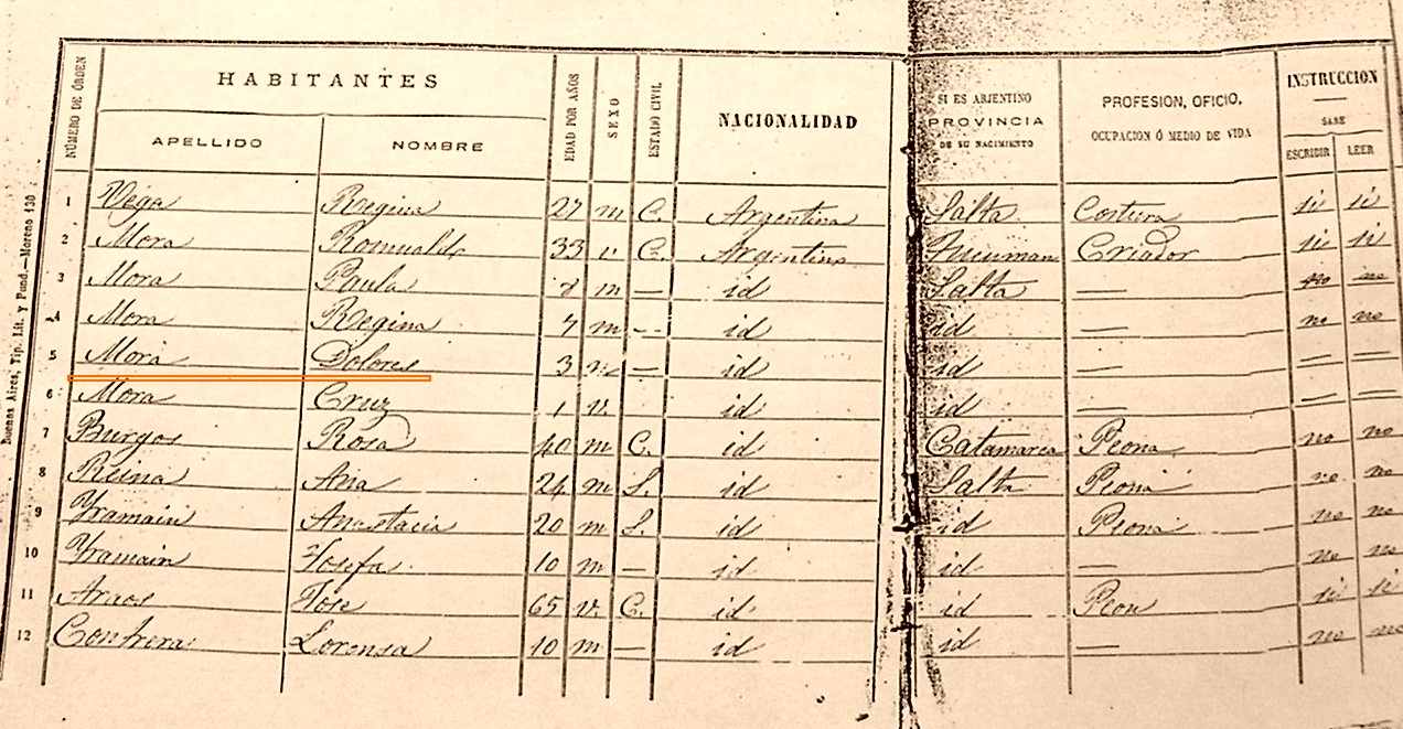 Durante la Presidencia de Domingo Faustino Sarmiento, tuvo lugar el 15 de septiembre el Primer Censo de la República Argentina. En el tomo 330 del Archivo General de la Nación, correspondiente al censo realizado en Salta Capital, Cachi y La Candelaria, en el "Libreto de Censo" de la Sección Tala - Dpto. La Candelaria (Salta), sus padres declararon que la pequeña "Lola" (Dolores Mora) de tres años de edad, de sexo m (mujer), de nacionalidad argentina igual que todos sus hermanos, había nacido en dicha localidad de la Provincia de Salta. En prueba de ello, se adjuntan las fotos de dichos documentos, debidamente Certificados por el Archivo General de la Nación:
