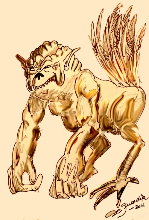 eidad diaguita, leyenda conocida en las provincias de La Rioja, Tucumán, Santiago del Estero y Salta. Según se cuenta, es esquivo y poco sociable; se lo reconoce por su grito ululante, casi como un lamento en la noche. Deja una pisada desconocida, que se parece a la de un gallo; algunos lugareños lo describen como un animal demoníaco, que tiene la mitad del cuerpo de humano, y la otra mitad de perro, patas de gallo, manos enormes y una larga cola emplumada. No siempre ataca a los hombres, comúnmente los espía.