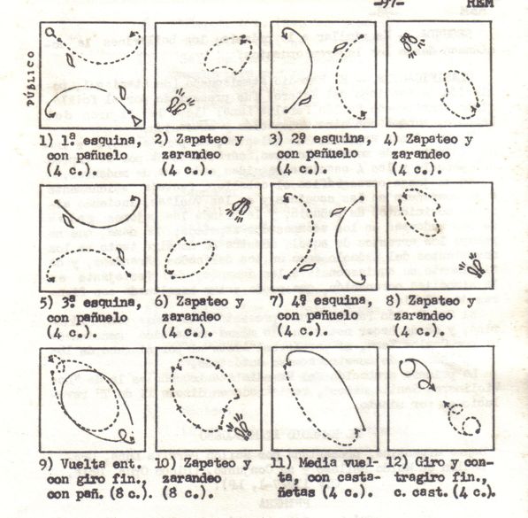 Tiene una introducción y 56 compases de baile. Tanto las esquinas como los zapateos son de cuatro compases cada uno.  Como vemos en el cuadro donde se muestra la coreografía de la danza.