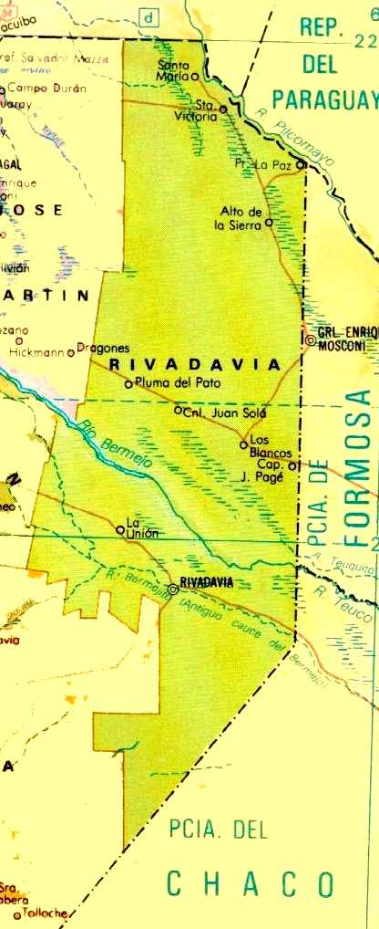 Rivadavia, ubicado en la Banda Sud del río Teuco, era hasta hace pocos años la cabecera del departamento que lleva su nombre. Sin embargo este pueblo es el más importante en la Banda Sud y lugar donde reside el municipio.