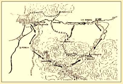 Fadel, José. 1966 croquis sobre los posibles caminos hasta la Quebrada de la Horqueta, lugar donde murió el prócer. Mapa que también figura al final del presente estudio donde se marca los itinerarios A.C. B.F. tal cual lo hiciera Don Fadel al difundirle, tal como fue en su origen, y sobre el cual luego marcaron otros estudiosos su propuesta de hipótesis.