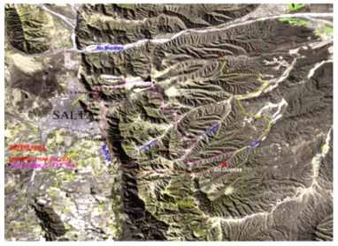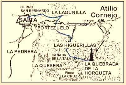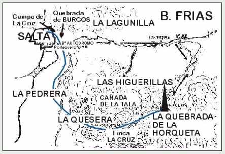 que tienen por base el camino trazado por el Dr. Atilio Cornejo en 1944. descripción escrita y de mayor compatibilidad entre la Documentación Histórica escrita y oral con la Cartografía Computacional Satelital. “ téngase presente que en aquellas épocas se usaba indistintamente los términos quebrada o cañada, según resulta del plano del lugar que se incluye en este trabajo; como que quebrada, gramaticalmente, tanto significa abertura angosta y áspera entre montañas, como quiebra o hendidura de la tierra en los montes, o la que causan las lluvias excesivas en los valles; y Cañada se llama al espacio entre dos montañas poco distantes entre sí...” aclaración que realiza el Dr. Atilio Cornejo en el Libro “ Contribución a la Historia de la Propiedad Inmobiliaria de Salta en la Época Virreinal, Bs. As.1945.- la descripción es: Belgrano y Balcarce, Cerro San Bernardo, Quebrada de Burgos, Quebrada de Robledo, La Lagunilla, La Higuerillas, Cañada de la Tala, Cañada de la Orqueta.