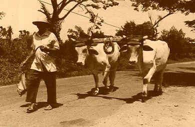 El que manejaba la yunta de bueyes estaba siempre en la sombra, debajo de algún paraíso o algarrobo que bordeaba el camino en las cercanías del pantano o arroyo crecido. Los bueyes adormilados rumiaban lenta y pacientemente, mientras el peón, rústico, de color terroso, con las canillas cubiertas en parte por una costra de barro seco, succionaba su interminable acuyico, entrecerrando los ojos ante los reflejos de los rayos del sol.