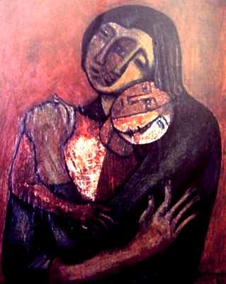 La imagen presenta al hombre americano, andino, -dice el pintor-, sumergido en sus enigmas ancestrales y abordado por las pasiones actuales en búsqueda de su identidad. Sus perfiles aparecen mediatizados en la piedra rugosa y teñidos de los colores terrosos, indefinidos: verdoso amarillento... como si la pureza cromática del arco iris le fuera esquiva. Y el gris y el negro como protagonistas.