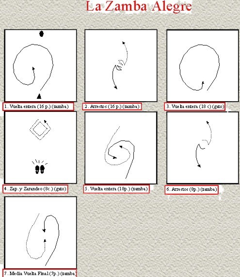 Se baila de una pareja, enfrentados, con pañuelo y con castañetas. Esta danza tiene una particularidad musical, posee dos movimientos , el de zamba y el de gato, alternados 16 compases de zamba, 16 compases de gato y 12 compases finales de zamba, como se muestra en el cuadro coreográfico.
