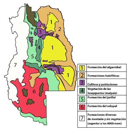 b) El mapa representa la distribución de los distintos tipos de formaciones vegetales en el territorio provincial. Investiguen las características de cada una de ellas, especies típicas, fauna asociada, adaptaciones al medio, suelos y relieve característico. ¿Qué son los oasis mendocinos? ¿Dónde se encuentran? Caracterícenlos.