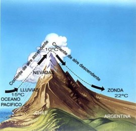 e) Investiguen qué es el viento zonda y luego expliquen el siguiente diagrama. ¿Qué características tiene este viento? ¿Cuándo sopla? ¿Qué consecuencias tiene sobre el clima y el ambiente locales?